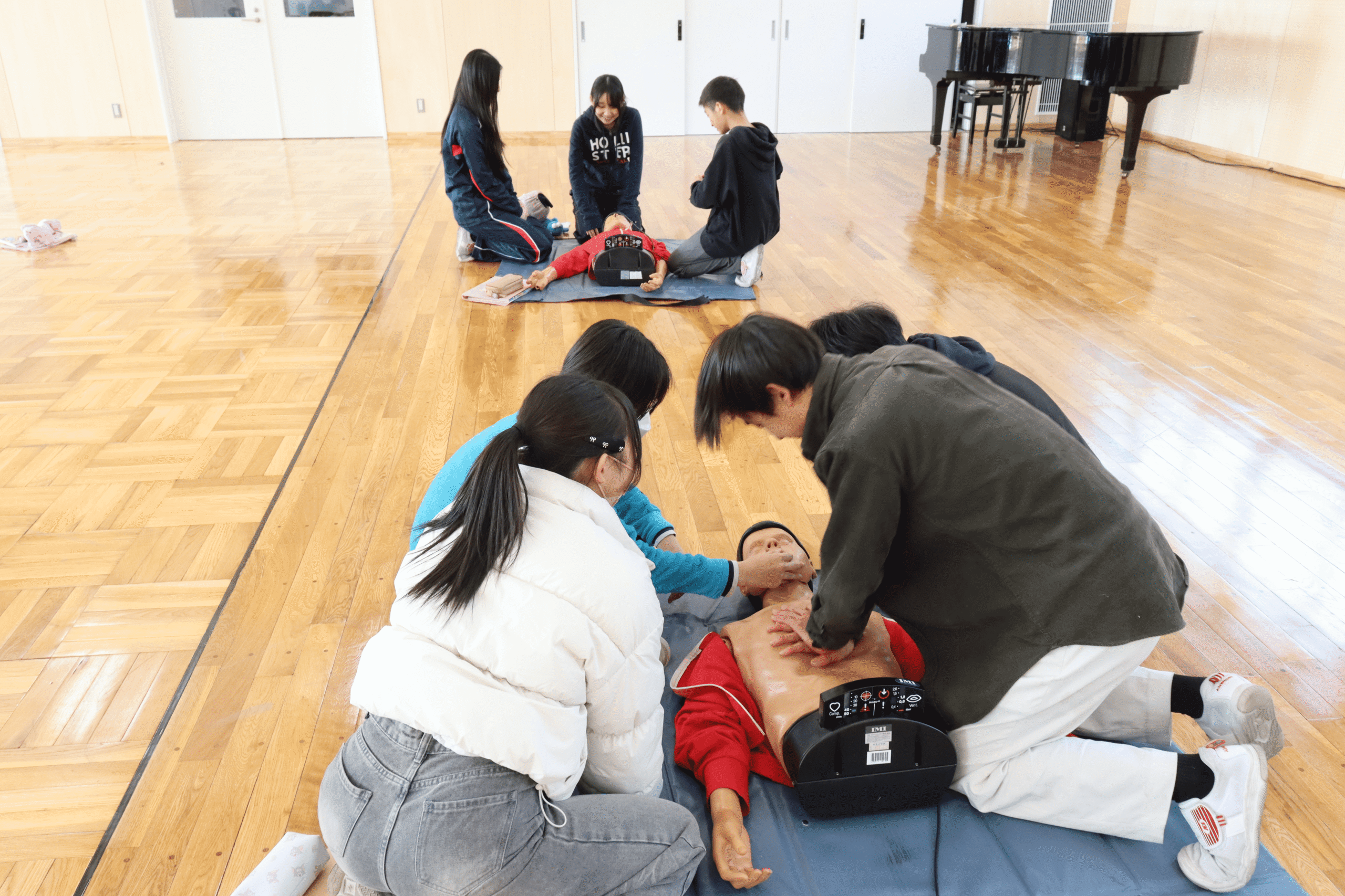 大ホールは以前大教室だった場所です。カタチはかわっていませんが、壁を張り替え、床は新たにワックスをかけてピカピカになりました‼とても広いので、40人で使っても十分なスペースがあります。今日は心肺蘇生用の人形を使って、胸骨圧迫と気道確保の授業を行いました。